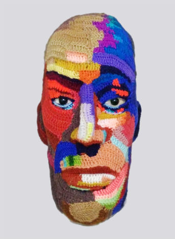 Face 12 is part of the artist's Face series. The mold is crafted from papier-mâché, with the top layer created through detailed crochet using knitting yarn. The artist aimed to capture a wide range of human emotions through expressive facial features.